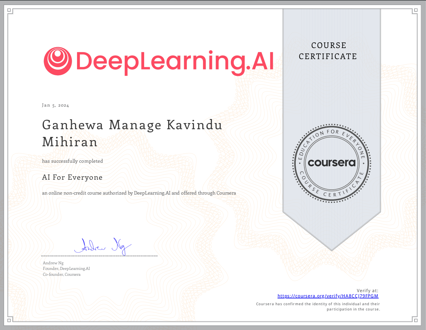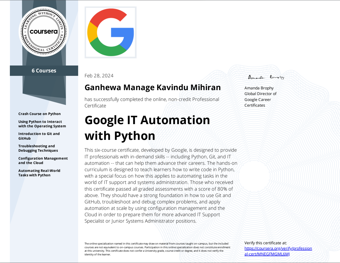 I have accomplished the Google IT Automation with Python six-course certificate, a program developed jointly by Google and Coursera, showcasing proficiency in automation using Python. Moreover, I am now certified in Stanford University & DeepLearning.AI Machine Learning Specialization, having completed three courses within the specialization. Having completed a Full Stack Developer course as a trainee, I've had the opportunity to dive into the world of web development, honing my skills in both front-end and back-end technologies.Additionally, I have completed the AI/ML Engineering course, developed in collaboration with SLIIT.